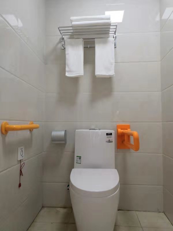 老人房间里有衣柜、床头桌、电视、空调、饮水机、独立卫浴、安全扶手、紧急呼叫系统等设备齐全